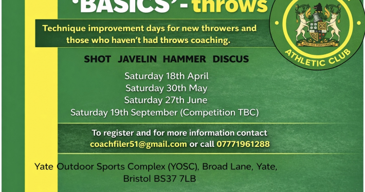 Yate & District AC are putting on a number of coaching days for young throwers who haven’t had the benefit of formal coaching or are relatively new to throwing. The days would also be useful to current throwers looking for a technical edge to improve their performances.